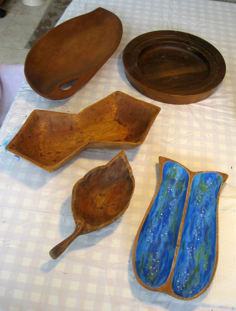 I've started on a new idea this week. I collected a few old wooden bowls & dishes at a thrift store recently. After some TLC as needed for each, I will paint the inside surface and varnish it. Here is my first collection, with one I've started working on: